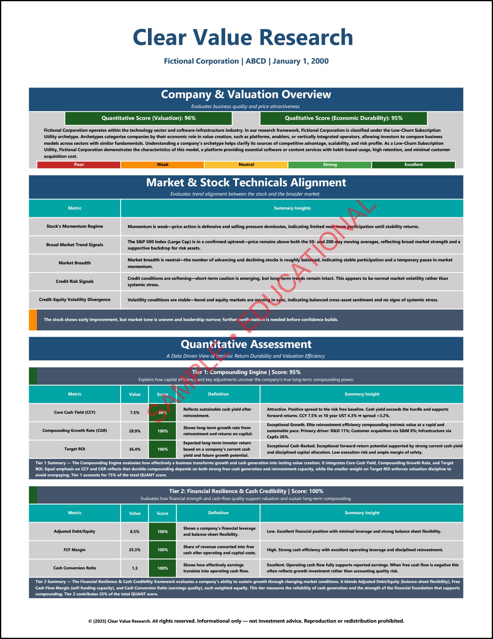 Clear, rules-based research that shows business quality, real valuation, and timing — without hype, predictions, or stock picks.