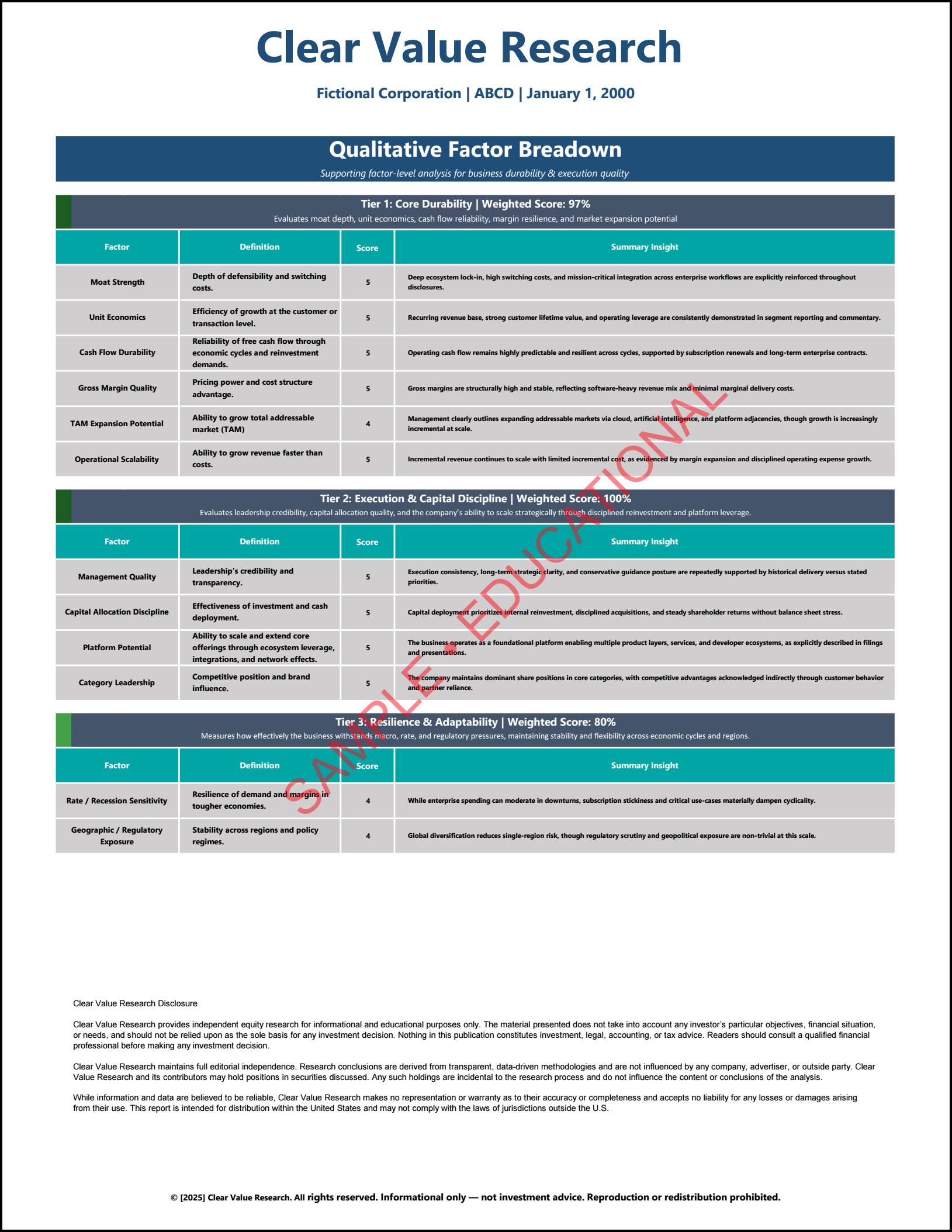 In just two pages, each report organizes business durability, valuation, and market context into a consistent structure, so decisions can be made calmly and deliberately.